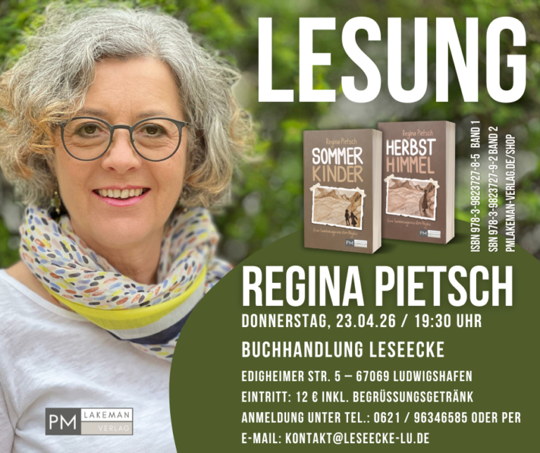 PMLakeman-Verlag Literatur mit Leidenschaft Neuerscheinungen (für weitere Info auf das Bild klicken) Neuerscheinung in Vorbereitung – erscheint Mai 2026 Soundtrack einer Stadt von Mathias Aicher, Christina Bacher und Michael Halberstadt im PMLakeman-Shop vorbestellen Neuerscheinung – Die Fortsetzung von "Sommerkinder" Herbsthimmel von Regina Pietsch im PMLakeman-Shop kaufen Neuerscheinung – Lisa Schneiders neuer Fall! Die flotte Lotte von Ingrid Reidel im PMLakeman-Shop kaufen Familiensaga aus dem Allgäu Sommerkinder von Regina Pietsch im PMLakeman-Shop kaufen Dem Leben die Hoffnung abtrotzen Manchmal das Glück von Ulrike Sabine Maier im PMLakeman-Shop kaufen Wie wäre es mit einer neuen Idee? Im Auftrag der sichtbaren Gefühle von Frank Schelling im PMLakeman-Shop kaufen Authentisch. Ermutigend. Und voller Hoffnung. In mir ein ganzes Universum von Lea Zander im PMLakeman-Shop kaufen Aktuelles Verlagsprogramm 02/25 runterladen (PDF, 11 MB) Aktuelles Frank Schellings neuer Roman Mehr erfahren Leseproben Mehr erfahren Rund um die Uhr für euch da – unser Online-Shop! Mehr erfahren Programm Alle Bücher Stories Kurzgeschichten PMLakeman-Verlag Über uns