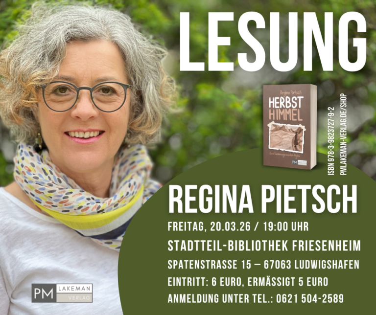 PMLakeman-Verlag Literatur mit Leidenschaft Neuerscheinungen (für weitere Info auf das Bild klicken) Neuerscheinung in Vorbereitung – erscheint Mai 2026 Soundtrack einer Stadt von Mathias Aicher, Christina Bacher und Michael Halberstadt im PMLakeman-Shop vorbestellen Neuerscheinung – Die Fortsetzung von "Sommerkinder" Herbsthimmel von Regina Pietsch im PMLakeman-Shop kaufen Neuerscheinung – Lisa Schneiders neuer Fall! Die flotte Lotte von Ingrid Reidel im PMLakeman-Shop kaufen Familiensaga aus dem Allgäu Sommerkinder von Regina Pietsch im PMLakeman-Shop kaufen Dem Leben die Hoffnung abtrotzen Manchmal das Glück von Ulrike Sabine Maier im PMLakeman-Shop kaufen Wie wäre es mit einer neuen Idee? Im Auftrag der sichtbaren Gefühle von Frank Schelling im PMLakeman-Shop kaufen Authentisch. Ermutigend. Und voller Hoffnung. In mir ein ganzes Universum von Lea Zander im PMLakeman-Shop kaufen Aktuelles Verlagsprogramm 02/25 runterladen (PDF, 11 MB) Aktuelles Frank Schellings neuer Roman Mehr erfahren Leseproben Mehr erfahren Rund um die Uhr für euch da – unser Online-Shop! Mehr erfahren Programm Alle Bücher Stories Kurzgeschichten PMLakeman-Verlag Über uns